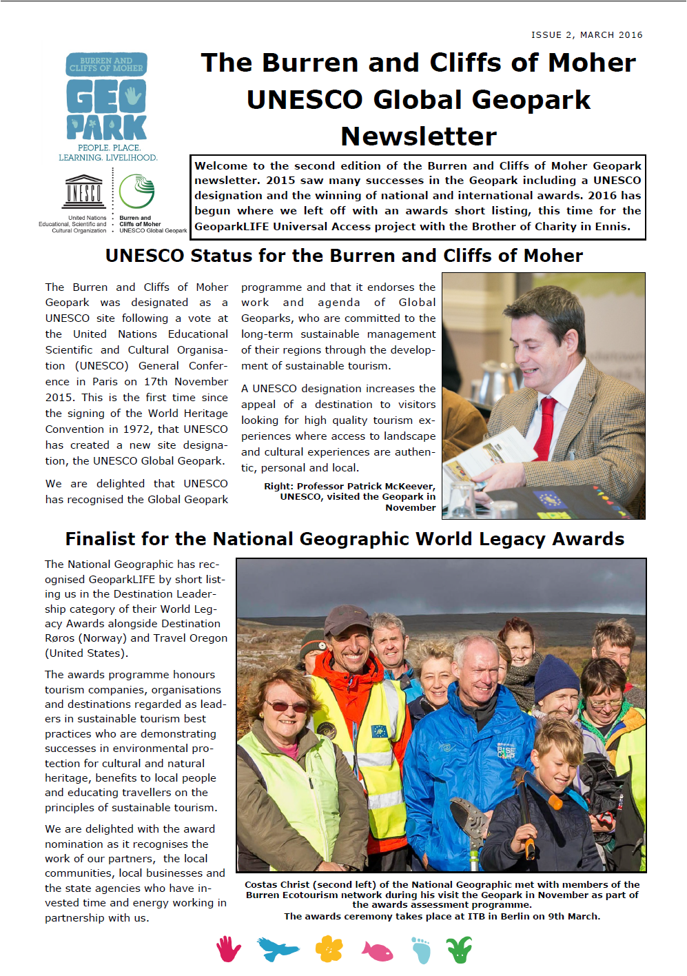 The second edition of the Burren and Cliffs of Moher Geopark newsletter wraps up our activity for 2015, which saw many successes in the Geopark including a UNESCO designation and the winning of national and international awards. 2016 has begun where we left off with an awards short listing, this time for the GeoparkLIFE Universal Access project with the Brother of Charity in Ennis.
