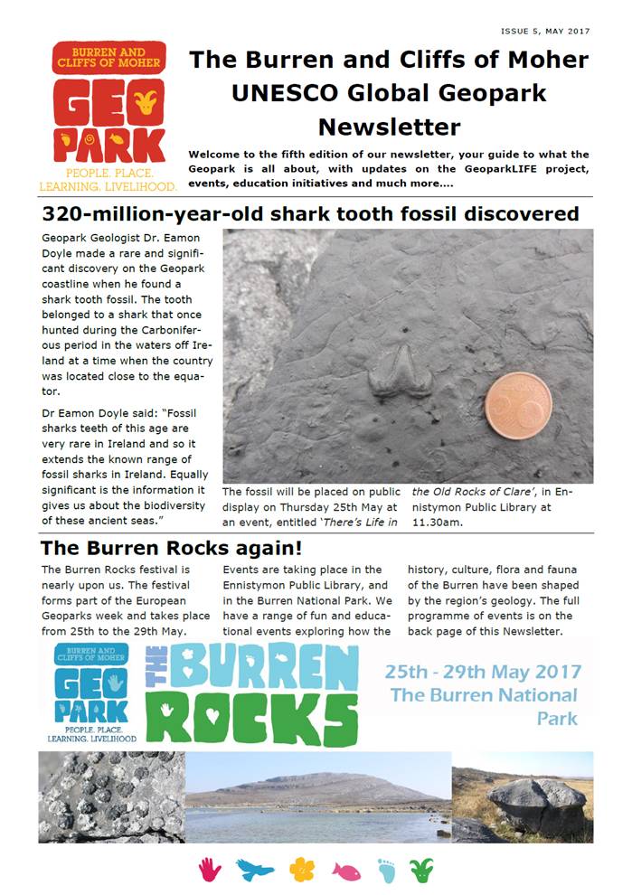 The fifth edition of the Burren and Cliffs of Moher Geopark newsletter is your guide to what the Geopark is all about, with updates on the GeoparkLIFE project, events, education initiatives and much more..