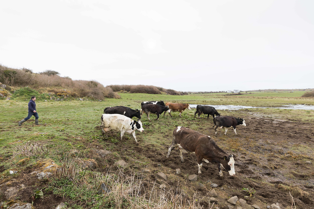 The Holstein Friesian cows that produce the milk for Burren Gold Cheese graze grass that grows on soil developed on glacial till, a chaotic mixture of glacially ground rocks and clay that were deposited on top of the Burren limestone by ice sheets that flowed south/southeast from Galway around 20,000 years ago during the peak of the last Ice Age. The ice sheets scraped the surface and incorporated and transported rocks from the land they flowed over. While most of the rocks in the glacial till are limestone derived from the Burren there are small amounts of rocks such as sandstones, granite and quartzite from Galway that give each deposit in the Burren its own unique geological flavour. There is an ancient tradition of farming at Caherconnell Fort, evidence of which is currently being uncovered by the Caherconnell Archaeological Field School. Cattle and sheep would have been protected from predators and rivals within the stone fort at night and grazed the local grasslands under supervision during the day. The art of using sheepdogs to move and protect cattle and sheep in the open expanse of the Burren is still practised there today.